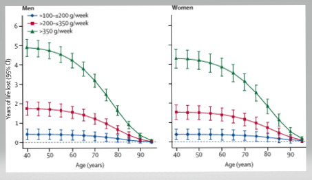 Étant un buveur assidu, j’ai été particulièrement intéressé par la partie de l’étude traitant du rapport entre consommation d’alcool et durée de vie. Après avoir fait bouillir dans les grandes marmites statistiques les observations recueillies auprès de plus d’un demi-million de buveurs dans 19 pays à hauts revenus, l’étude détermine les années de vie perdues en fonction de l’âge et de la consommation des buveurs, indépendamment des nombreux autres paramètres qui affectent eux-aussi la durée de vie. Je précise que c’est bien l’article publié le 14 avril 2018 qui m’intéresse ici et pas celui du 24 août 2018 que j’évoquerai brièvement.